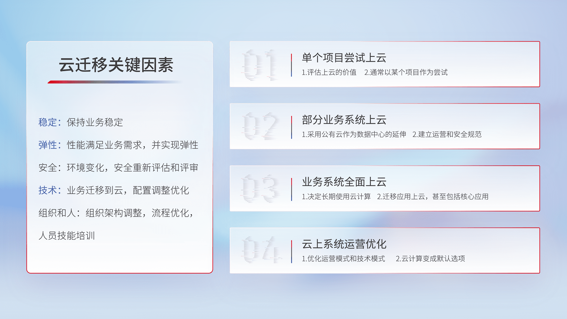结合实际业务,,,从规划设计、、、云平台选型、、云原生改造、、、数据迁移、、、集成交付,,迁移全过程为客户识别最佳上云路径,,做好风险识别管理,,,,设计网络架构、、、身份权限、、、安全审计合规、、操作审计、、、、日志审计、、、、监控告警策略、、、多站点容灾设计等,,,对云上基础设施进行整体规划,,,,提升IT治理水平,,以满足弹性、、高可用、、、、高性能的需求。。。。