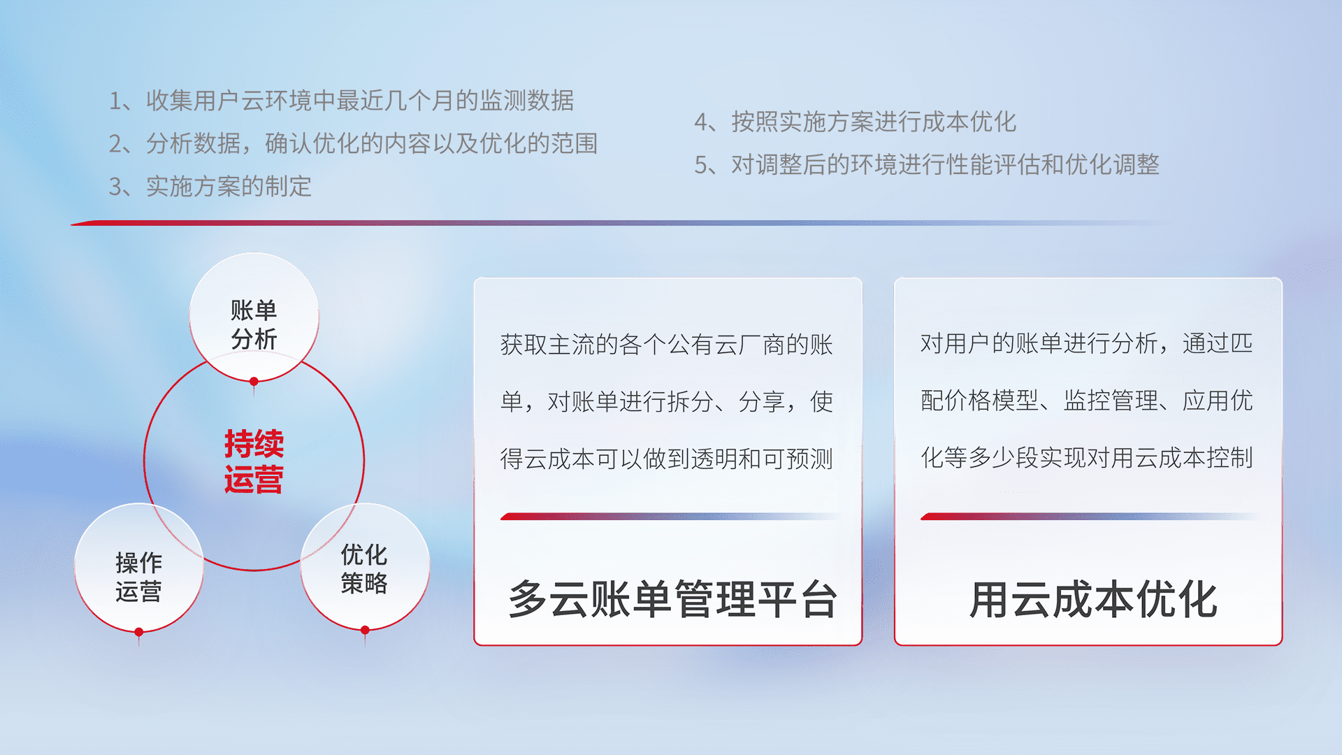 通过多云纳管,,,以统一的资源数据模型把客户的云资源进行抽象和封装,,,,进而实现对多云资源的统一操作,,,保障云资源管理的可靠性、、、、稳定性与可用性。。。。量身定制化运维内容,,,配置、、、开发运维、、补丁管理、、、、备份、、、、监控、、、、认证和访问管理、、审计和日常巡检等,,保障在用云过程中的可靠度,,,稳定度以及高可用率。。。。