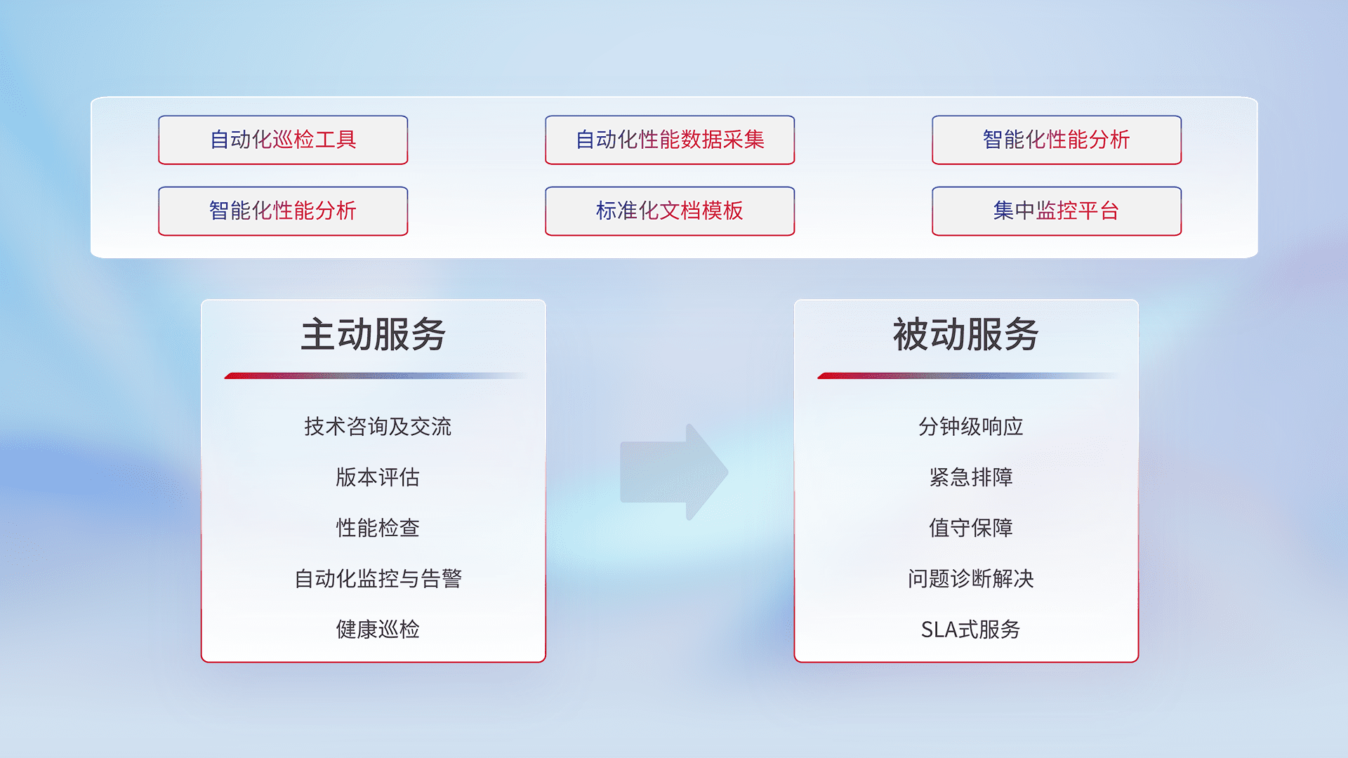 智能化工具和标准化文档,,保障服务质量,,,,提供主动服务(包含技术咨询、、、、版本评估、、性能检查、、、、自动化监控与告警、、、、健康巡检)和被动服务包含(分钟级响应、、、、紧急排障、、值守保障、、、、问题诊断解决、、SLA服务)。。。。
